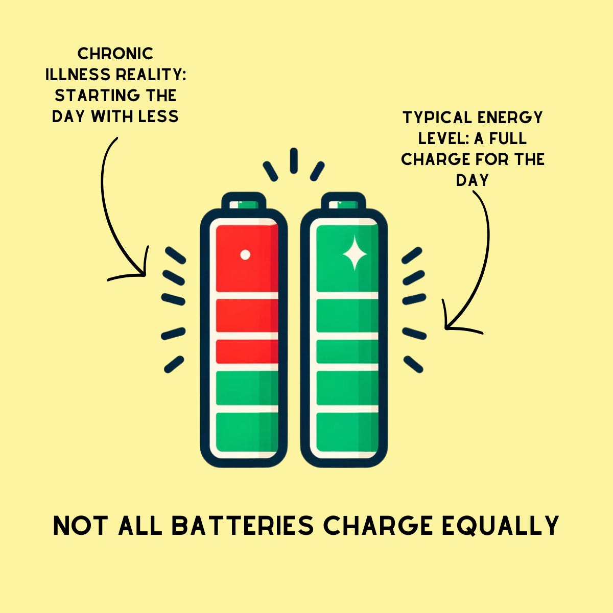 Our daily lives often begin with 'batteries' partially depleted—a metaphor that resonates deeply within our community. I created this visual to help articulate the unique challenges of managing energy day-to-day and underscores our resilience and strategic life management.