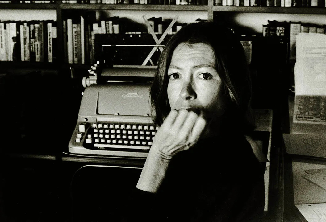 Joan Didion rests her chin and mouth on her fist next to her typewriter - Brentwood, 1988 (Photograph: Nancy Ellison)